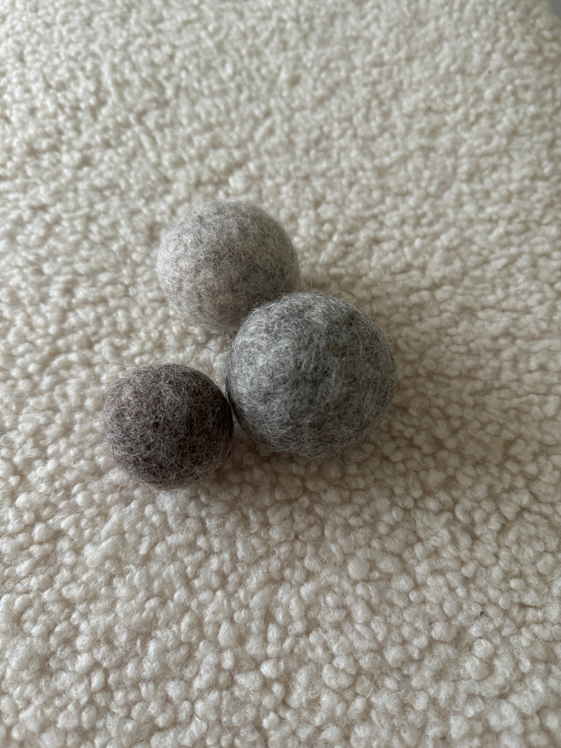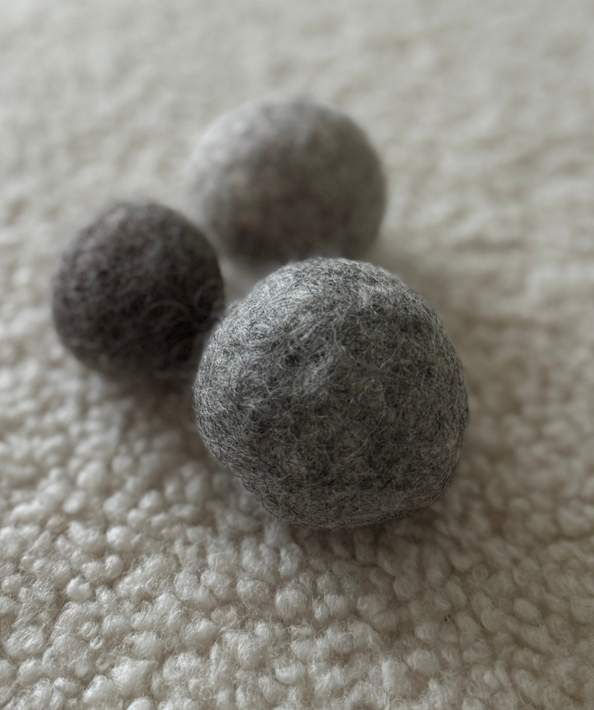 Disse bolde er håndlavede på Fyn, og er af 100% ren uld. De sælges i poser med tre styk. De er unika, dvs. at de ikke er helt ens, men de er alle i jordfarver/grå/råhvid.